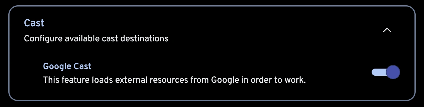 Google Cast support is disabled by default. The web UI uses Google-provided scripts and must retreive them from Google servers when the page loads. This is a privacy concern for some and is thus opt-in.